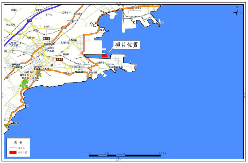 本項(xiàng)目位于葫蘆島港北港港區(qū)南部作業(yè)區(qū),也即北龍港現(xiàn)有港區(qū)突堤南側(cè)。
