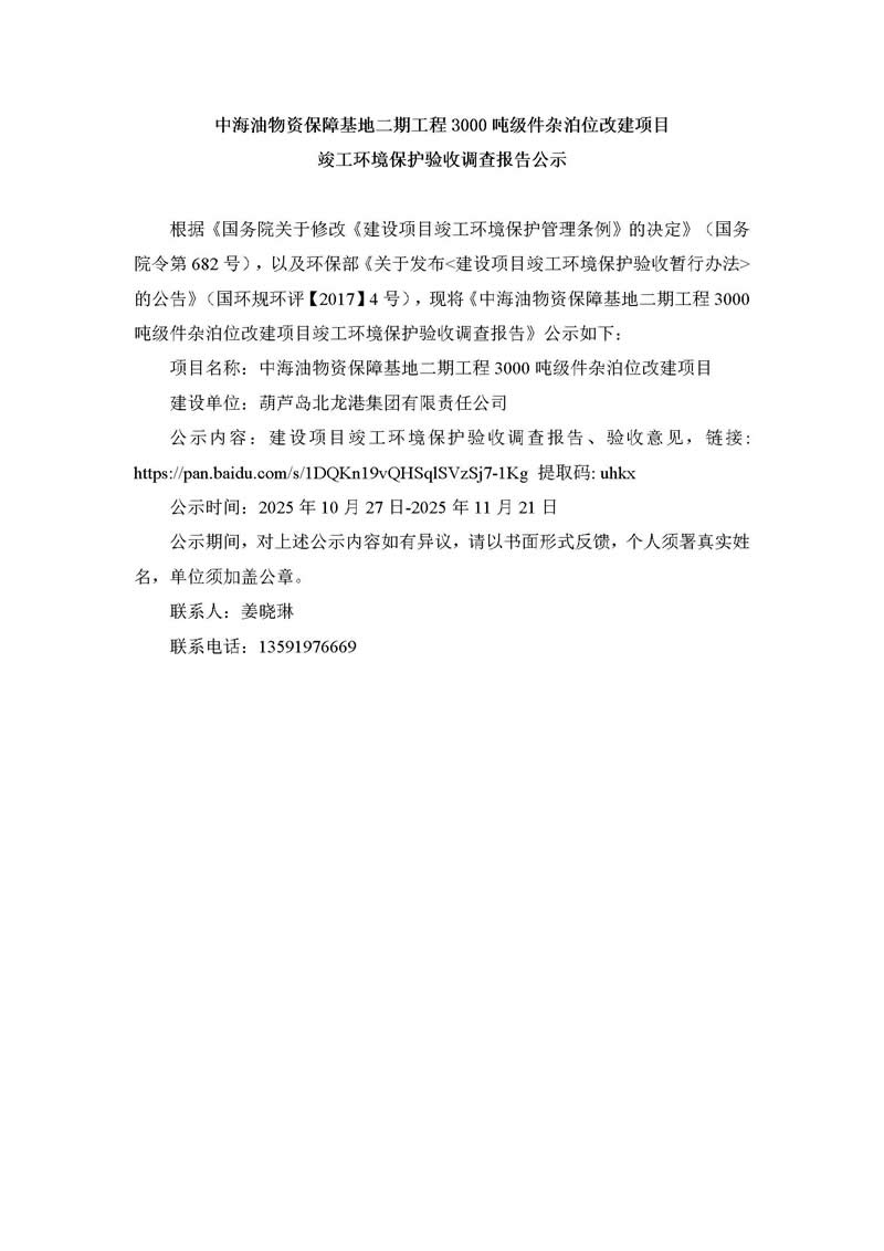 中海油物資保障基地二期工程3000噸級件雜泊位改建項目 竣工環(huán)境保護驗收調(diào)查報告公示